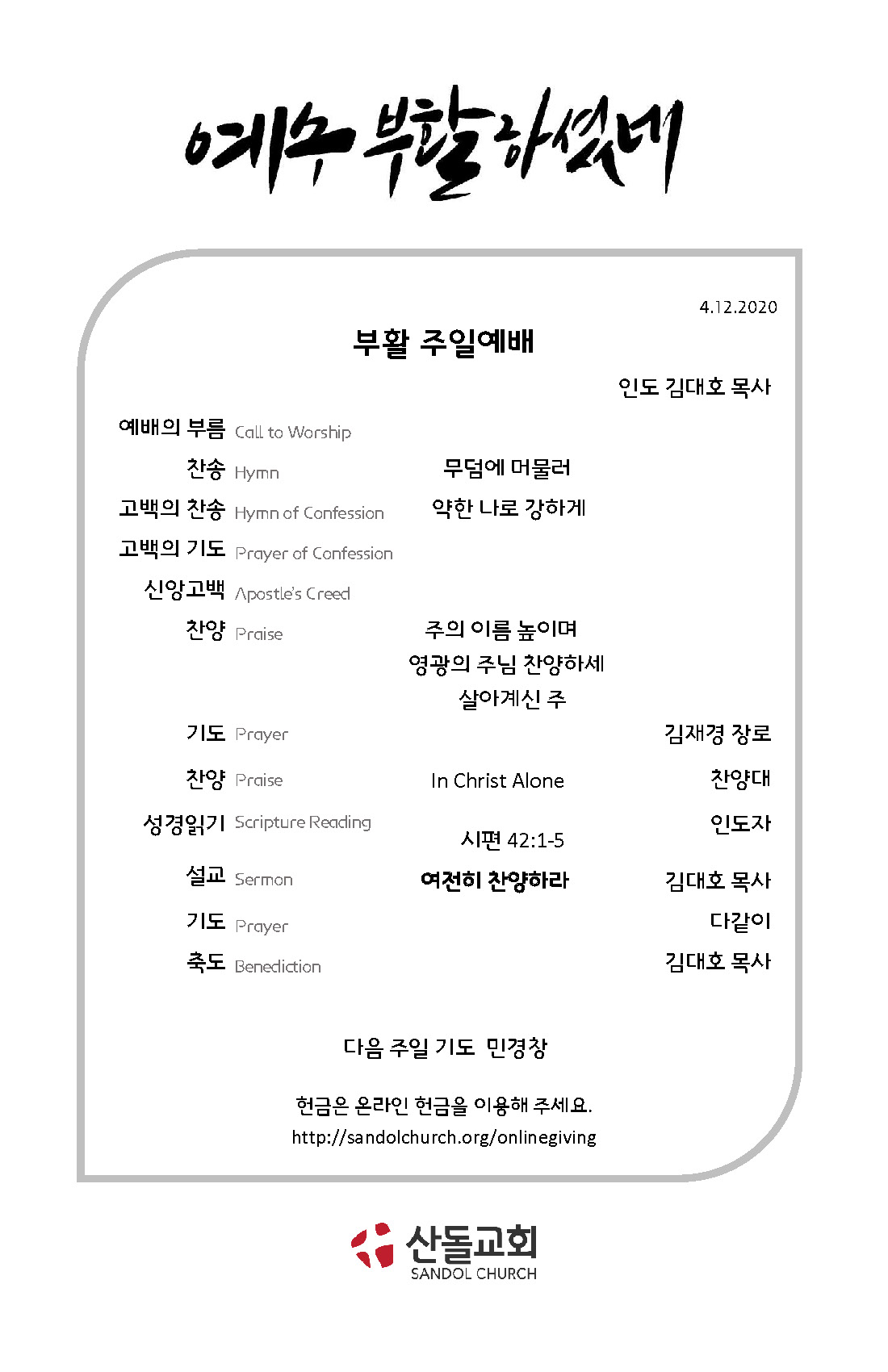 산돌소식 4월 12일 주보와 온라인예배 주소 작성자 Sandol 작성일 2020-04-12 09:25 조회 1747 4월 12일 부활주일예배 어린이교회 (화상예배) https://us04web.zoom.us/j/7800595486 EM@S KM@S 주일헌금과 부활절 특별헌금 https://sandolchurch.org/onlinegiving/ 인쇄 « 4월 5일 주보 4월 19일 온라인예배주소와 주보 » 목록보기 답글쓰기 전체 461 최신순 추천순 조회순 업데이트순 번호 제목 461 11월 9일 주일예배 주보와 온라인예배주소 460 11월 2일 주일예배 주보와 온라인예배주소 459 10월 26일 주일예배 주보와 온라인예배주소 458 10월 19일 주일예배 주보와 온라인예배주소 457 10월 12일 주일예배 주보와 온라인예배주소 456 10월 5일 주일예배 주보와 온라인예배주소 455 9월 28일 주일예배 주보와 온라인예배주소 454 9월 21일 주일예배 주보와 온라인예배주소 453 9월 14일 주일예배 주보와 온라인예배주소 452 9월 7일 주일예배 주보와 온라인예배주소 12345678910»마지막 전체 제목 내용 작성자 검색 Powered by KBoard