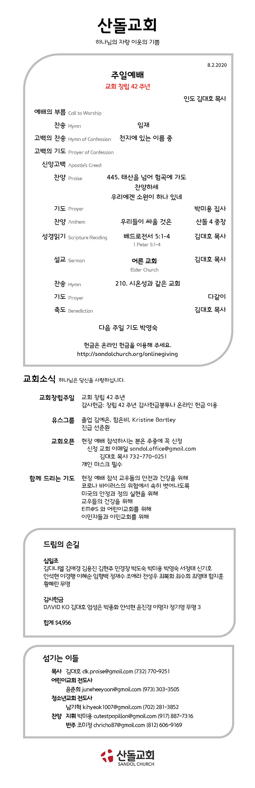 8월 2일 창립42주년감사예배 온라인 주소와 주보