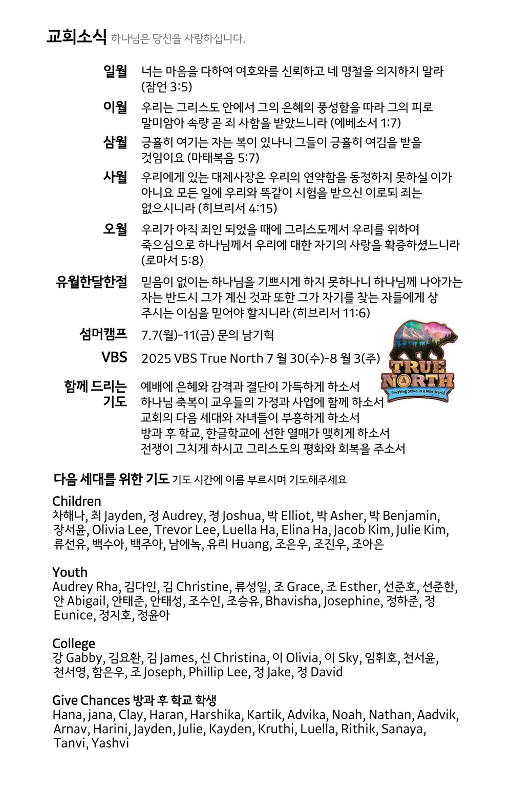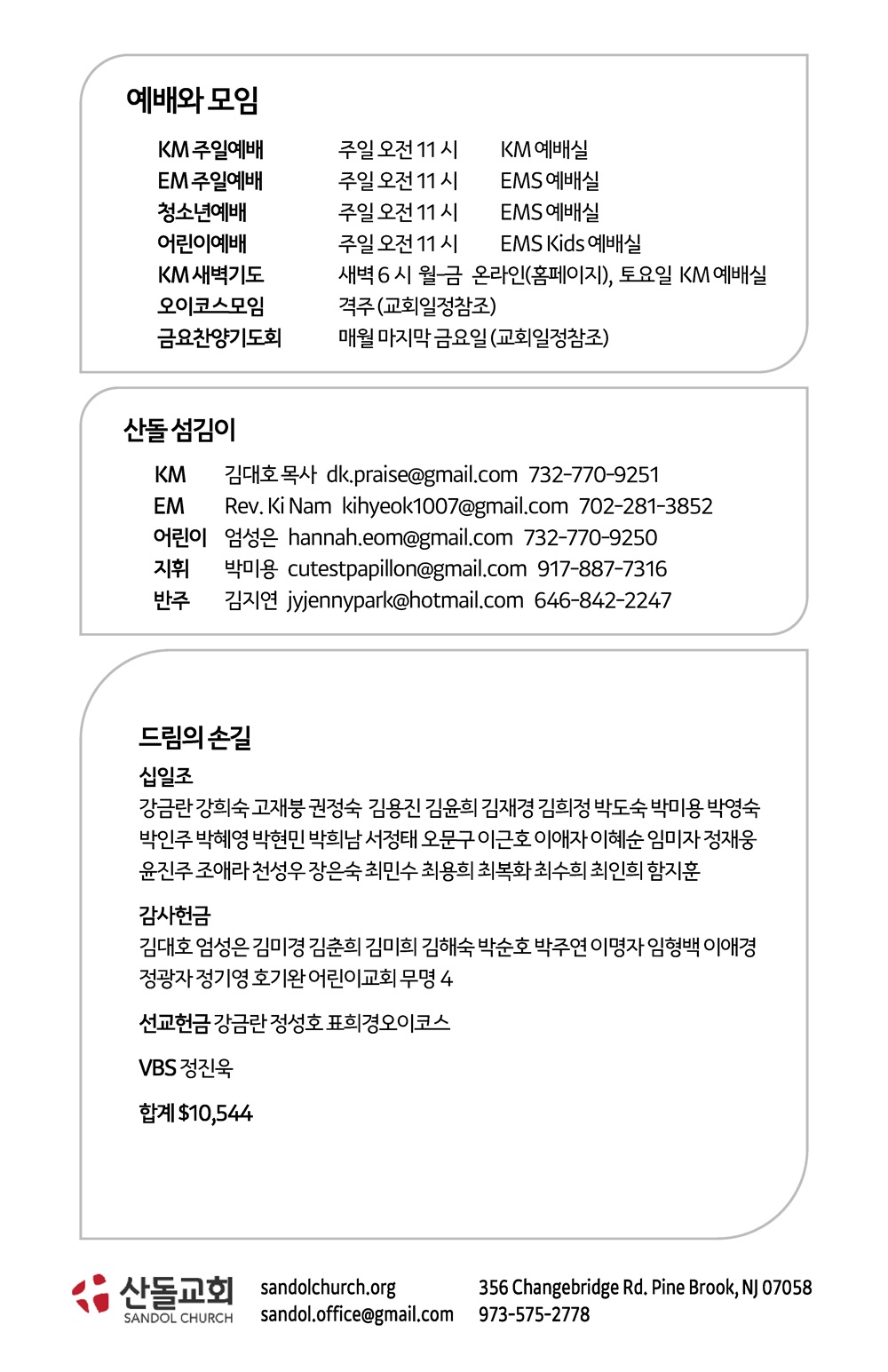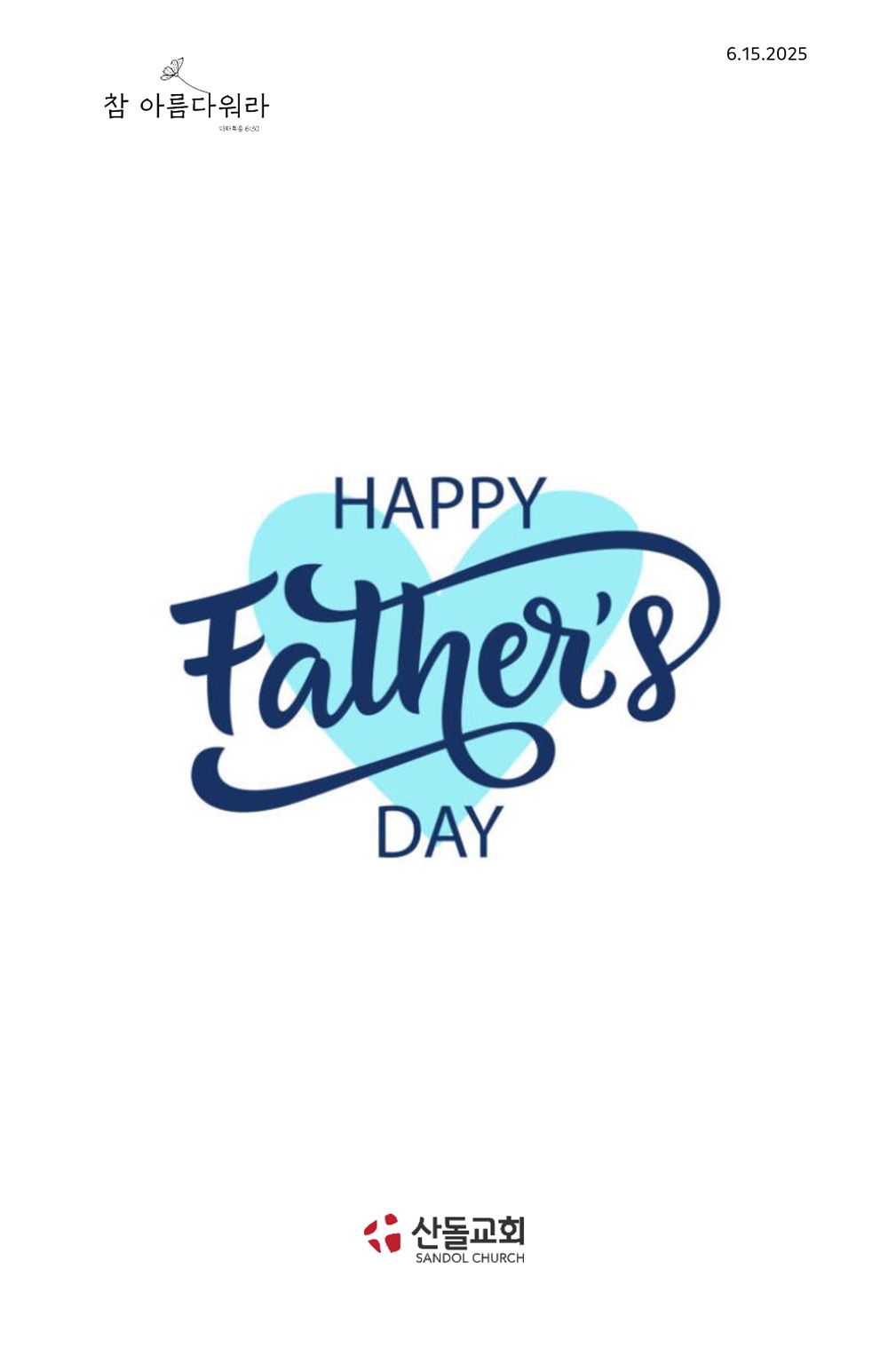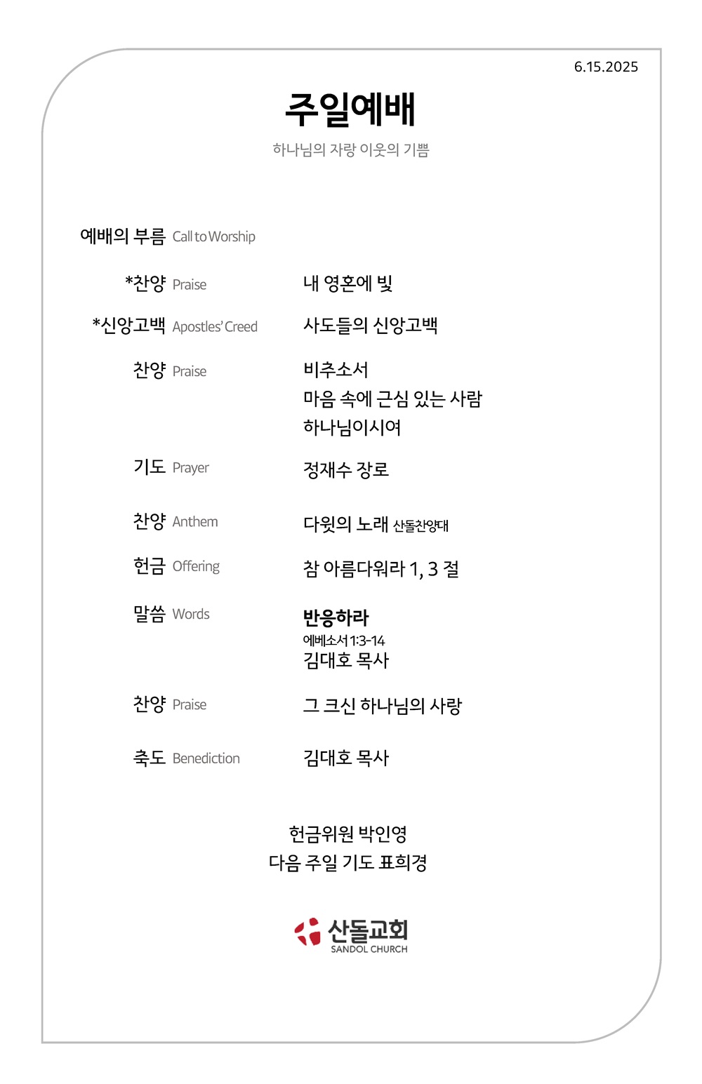 산돌소식 6월 15일 주일 예배 주보와 온라인예배주소 작성자 SANDOL 작성일 2025-06-14 18:24 조회 443 6월 15일 주일 예배 주보와 온라인예배주소 어린이교회 오전 11 현장 예배 EMS(English Service) 11:00am KMS(한국어 예배) 오전 11:00 인쇄 « 6월 8일 주일 예배 주보와 온라인예배주소 6월 22일 주일 예배 주보와 온라인예배주소 » 목록보기 답글쓰기 전체 475 최신순 추천순 조회순 업데이트순 번호 제목 445 7월 27일 주일 예배 주보와 온라인예배주소 444 7월 20일 주일 예배 주보와 온라인예배주소 443 7월 13일 주일 예배 주보와 온라인예배주소 442 7월 6일 주일 예배 주보와 온라인예배주소 441 6월 29일 주일 예배 주보와 온라인예배주소 440 6월 22일 주일 예배 주보와 온라인예배주소 439 6월 15일 주일 예배 주보와 온라인예배주소 438 6월 8일 주일 예배 주보와 온라인예배주소 437 6월 1일 주일 예배 주보와 온라인예배주소 436 5월 25일 주일 예배 주보와 온라인예배주소 처음«12345678910»마지막 전체 제목 내용 작성자 검색 Powered by KBoard