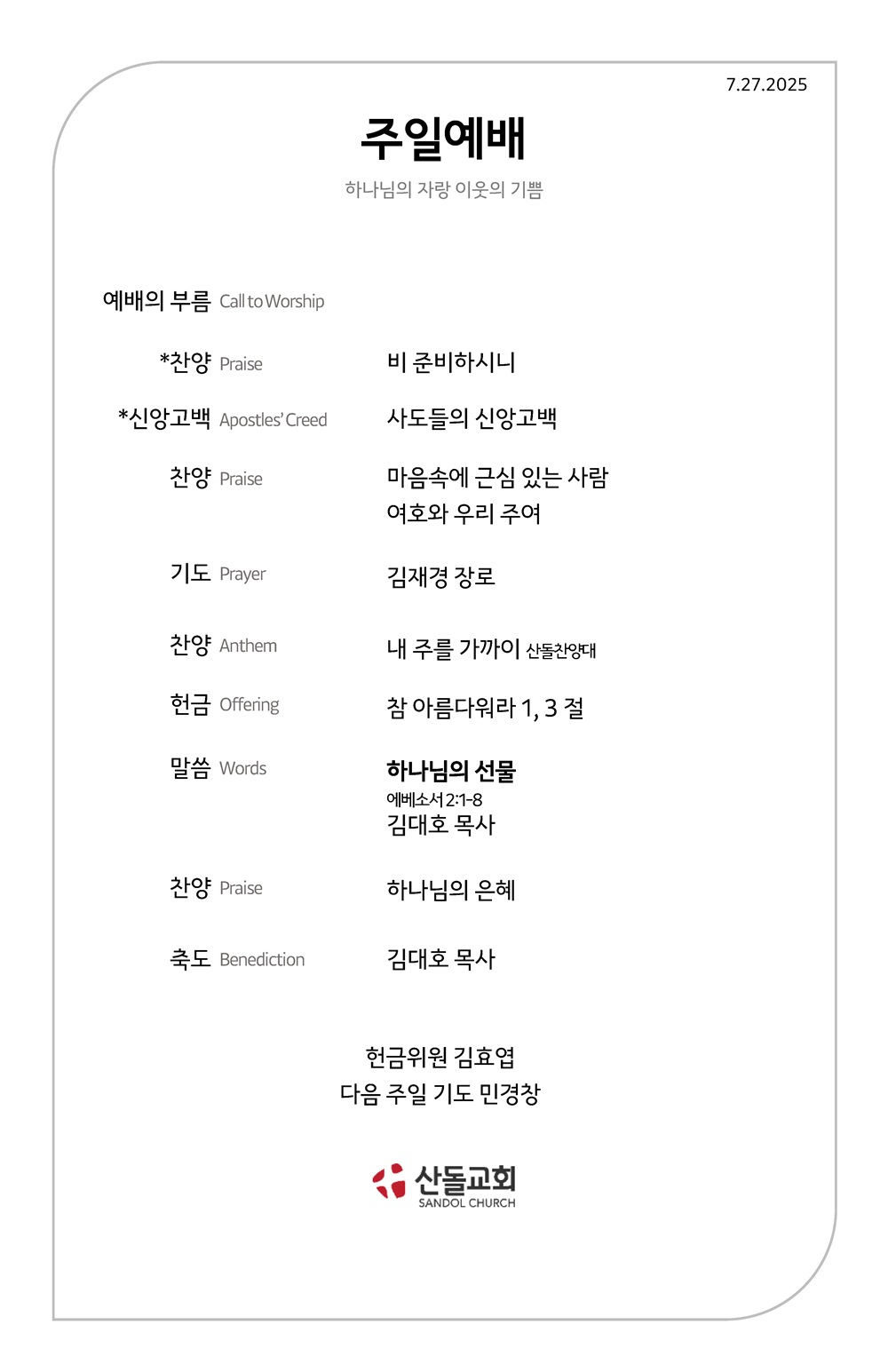 산돌소식 7월 27일 주일 예배 주보와 온라인예배주소 작성자 SANDOL 작성일 2025-07-27 07:19 조회 610 7월 27일 주일 예배 주보와 온라인예배주소 어린이교회 오전 11 현장 예배 EMS(English Service) 11:00am KMS(한국어 예배) 오전 11:00 인쇄 « 7월 20일 주일 예배 주보와 온라인예배주소 8월 3일 산돌창립47주년 축복주일연예배 주보와 온라인예배주소 » 목록보기 답글쓰기 전체 480 최신순 추천순 조회순 업데이트순 번호 제목 450 8월 31일 주일예배 주보와 온라인예배주소 449 8월 24일 주일예배 주보와 온라인예배주소 448 8월 17일 주일예배 주보와 온라인예배주소 447 8월 10일 주일예배 주보와 온라인예배주소 446 8월 3일 산돌창립47주년 축복주일연예배 주보와 온라인예배주소 445 7월 27일 주일 예배 주보와 온라인예배주소 444 7월 20일 주일 예배 주보와 온라인예배주소 443 7월 13일 주일 예배 주보와 온라인예배주소 442 7월 6일 주일 예배 주보와 온라인예배주소 441 6월 29일 주일 예배 주보와 온라인예배주소 처음«12345678910»마지막 전체 제목 내용 작성자 검색 Powered by KBoard